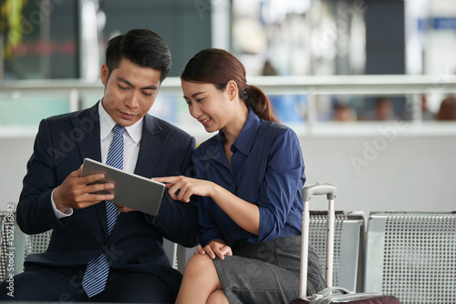 Business People Travelling On Passenger Train Using Digital Tablet By Poba