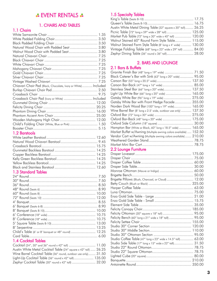 Price List Celebrations Party Rentals