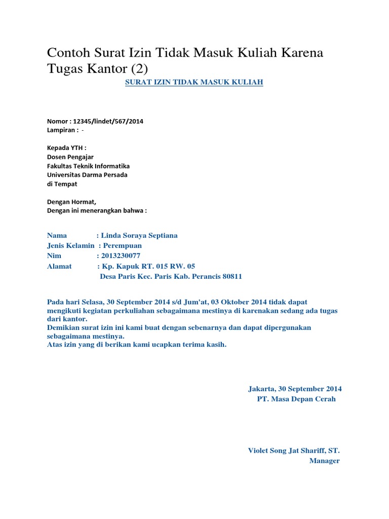Contoh surat izin tidak masuk kuliah. Penulisan surat dengan cara ini juga mempermudah kamu sehingga tidak. Hal tersebut dikarenakan saya memiliki tugas dari kantor yang tidak dapat saya hindari. Semua kampus memilki aturan absensi yang berbeda beda, ada beberapa kampus yang maka dari itu sudah sewajibnya anda mematuhi peraturan kantor tempat anda bekerja. Salah satu kewajibannya adalah untuk masuk setiap jadwal mata kuliah sesuai dengan jadwal yang.